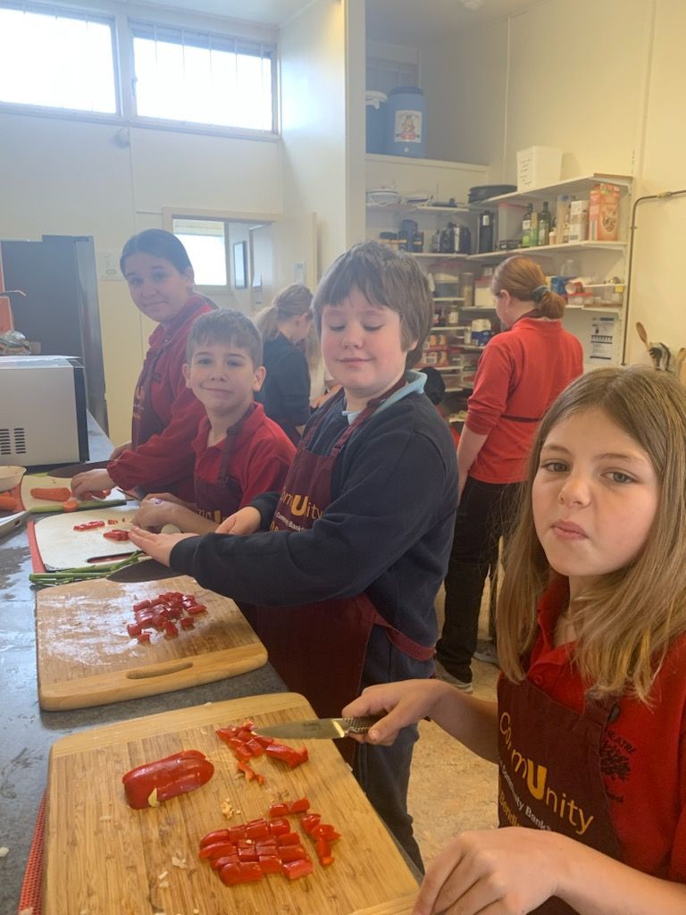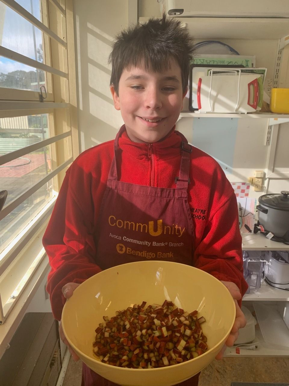 We used celery and spring onions from our school garden and rhubarb from Claire’s home garden. We wanted to use our carrots from the school garden but unfortunately they were not ready to be harvested yet.